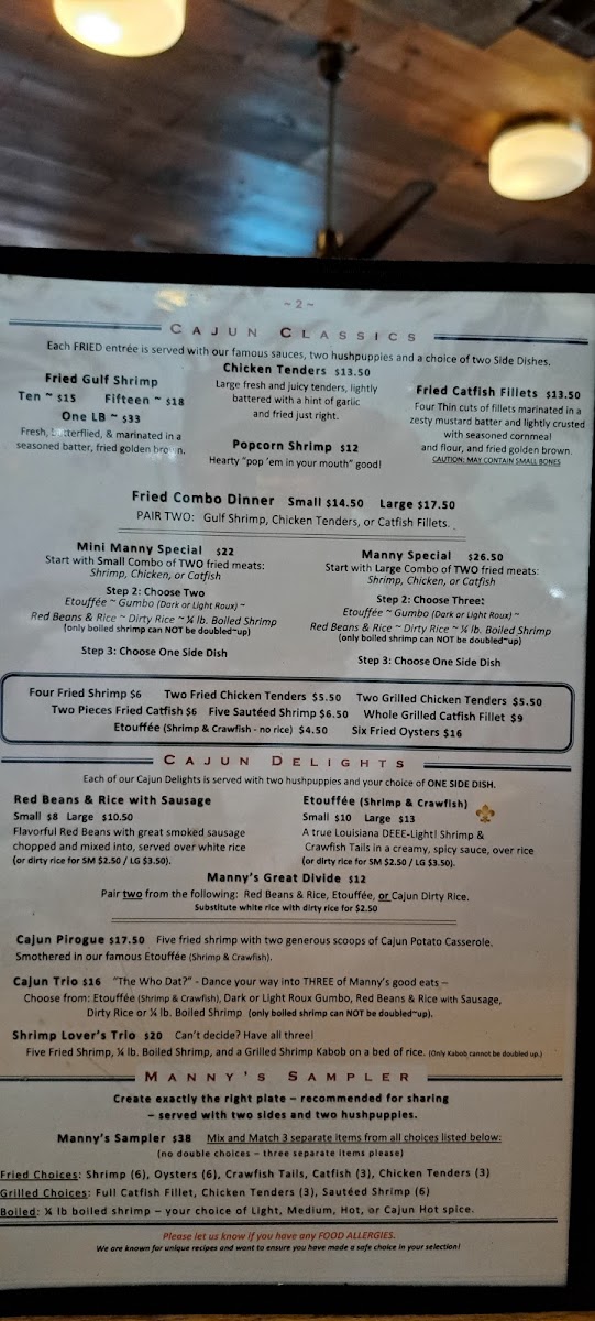 Introducing the menu at Shrimp Boat Manny's, seafood lovers are in for a delightful treat. Nestled in the heart of Livingston, TX, this gem is renowned for its fresh, flavorful dishes that truly capture the essence of coastal cuisine. Customers rave about the gumbo, hailed as "amazing," and the perfectly seasoned fish and shrimp, both staples that reflect the restaurant's commitment to quality and taste.